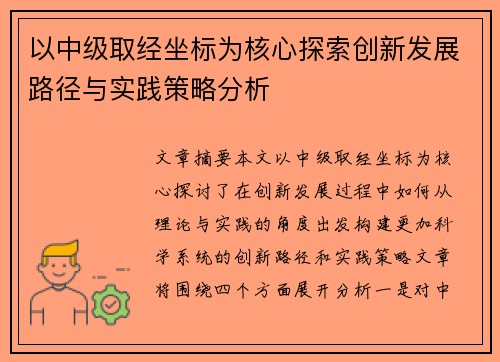 文章摘要:本文以“中级取经坐标”为核心,探讨了在创新发展过程中如何从理论与实践的角度出发,构建更加科学、系统的创新路径和实践策略。文章将围绕四个方面展开分析:一是对中级取经坐标的内涵与价值进行阐述,二是探讨如何通过创新机制促进产业结构的优化与升级,三是分析中级取经坐标在实际操作中的挑战与应对策略,四是探讨如何将中级取经坐标融入到企业与行业的发展战略中。每一部分都通过案例分析与理论结合的方式,全面展示了如何有效推动创新与发展。文章最后通过总结,归纳出中级取经坐标对于创新路径的意义,提出未来的发展方向。